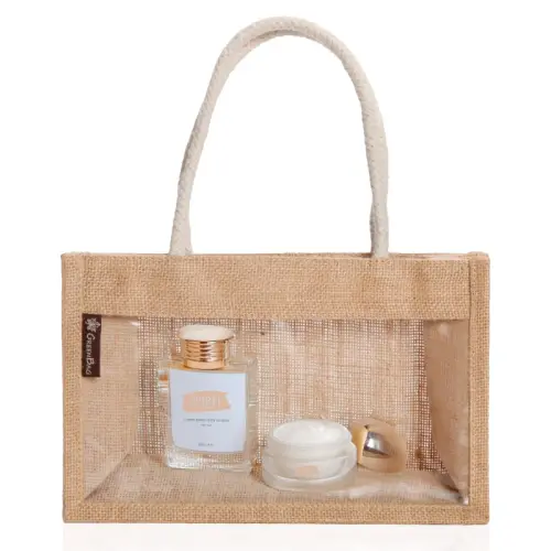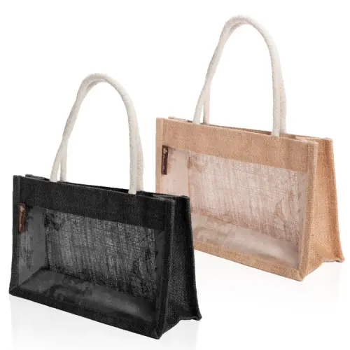 תיק מעוצב עשוי בד יוטה בשילוב PVC שקוף ידיות נשיאה קשיחות, 35 ס”מ 26X9X16 ס”מ